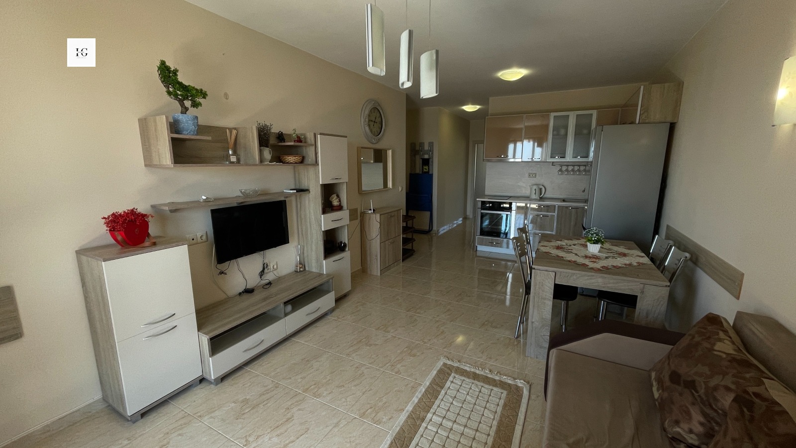 Продава се напълно обзаведен двустаен апартамент (68 кв.м, 4-ти етаж) с невероятна гледка към морето и планината.