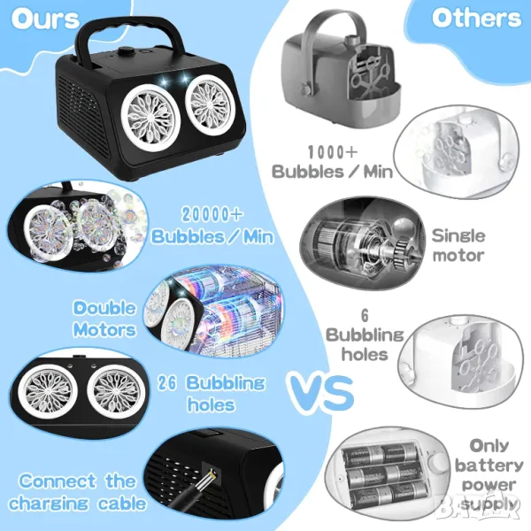 Нашият захранван с батерии производител на балончета разполага с преносима дръжка, така че можете да го вземете със себе си, където и да отидете. Bubble Maker се захранва от USB зареждане или 4 AA батерии (не са включени). Това ви предлага максимално удобство, което ви позволява да се наслаждавате на машината за мехурчета както на закрито, така и на открито. Може да се използва за бизнес, подходящ за рождени дни, семейни събирания и парти шоута край басейна.