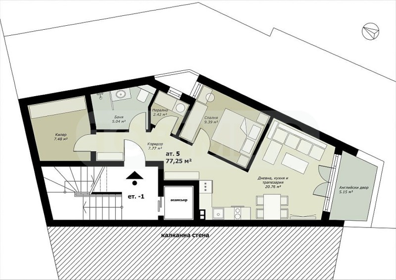 Имотът е разположен на сутеренен етаж с английски двор в шестетажна жилищна сграда с асансьор. На обща площ от 77,25 м2 са разпределени антре 7,77 м2, всекидневна 21 м2, спалня 10м2, санитарно помещение 5 м2, перално помещение 2,4 м2, килер(склад) 7,5 м2, английски двор 5 м2. Паркомясто включено в цената.