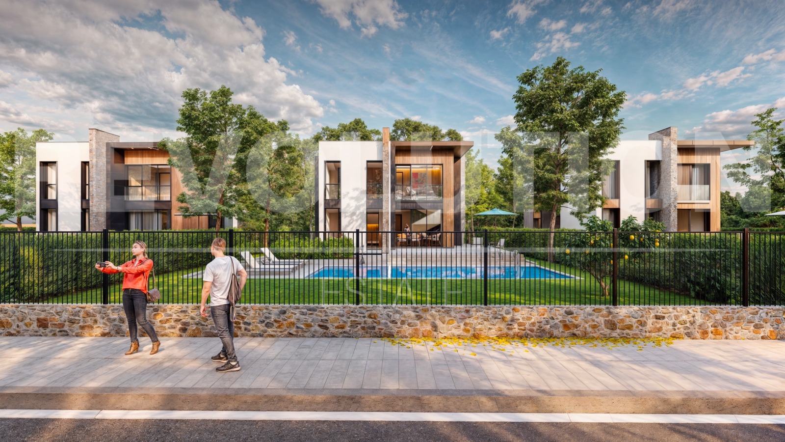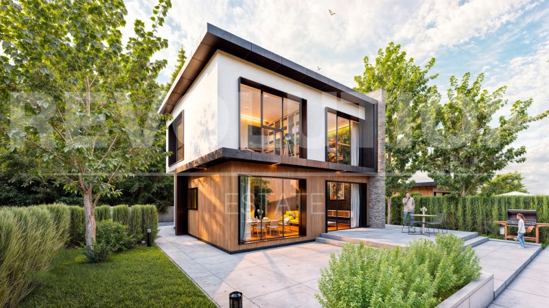 Къщите разполагат с композитно дърво, еталбонд, каменна облицовка и троен стъклопакет за отлична изолация.