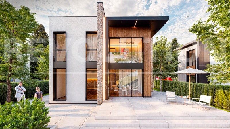 Къщите разполагат с композитно дърво, еталбонд, каменна облицовка и троен стъклопакет за отлична изолация.