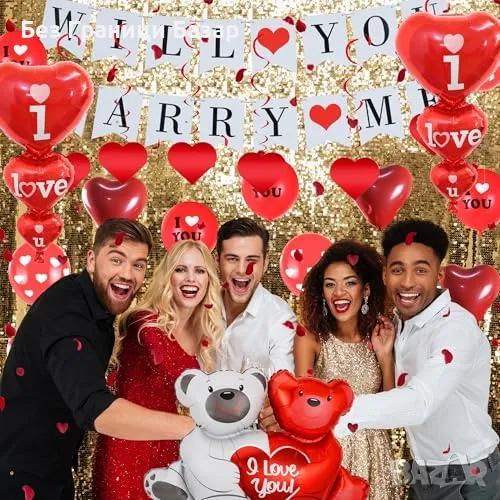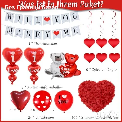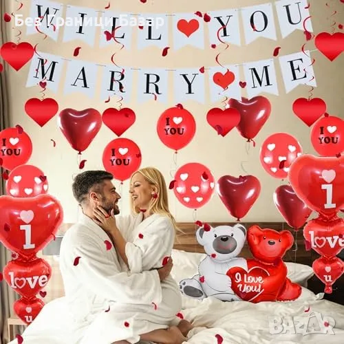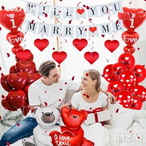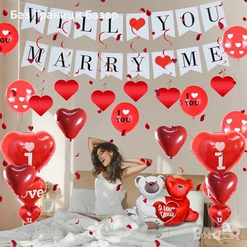 Романтичен комплект за декорация – 534 елемента, включително мече, балони, банер и розови листенца