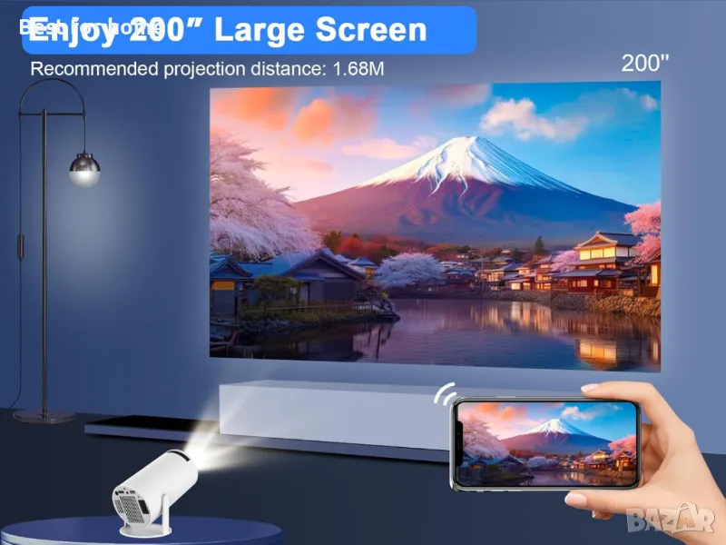 Автоматична корекция на трапецовидното изкривяване: Интелигентният проектор HY300 използва технология за автоматично корекция на трапецовидното изкривяване и ръчно фокусиране, за да ви даде перфектна картина; свършете работата за секунди. С максимален 130-инчов дисплей, създаващ незабравима филмова вечер или игрална сесия