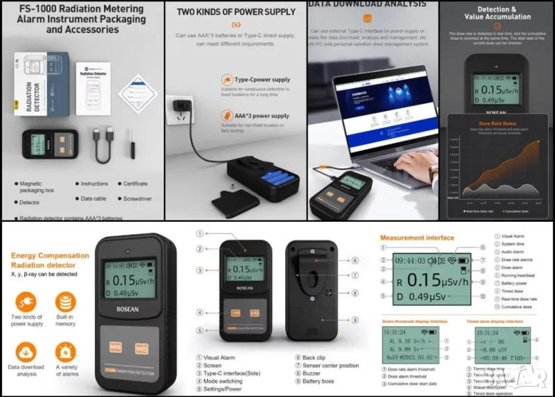 Детекторът за ядрена радиация BOSEAN FS-1000 се свързва с компютър чрез USB кабел, който поддържа софтуера за изтегляне, анализ, управление на данни и други функции. Устройството дава възможност за ясно и удобно проследяване на детайлите на натрупаната еквивалентна доза за по-добро разбиране и управление на данните.