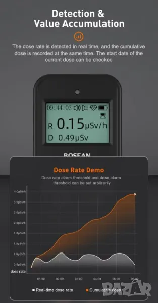 * Измерва дозовата скорост в реално време и записва натрупаната доза едновременно.