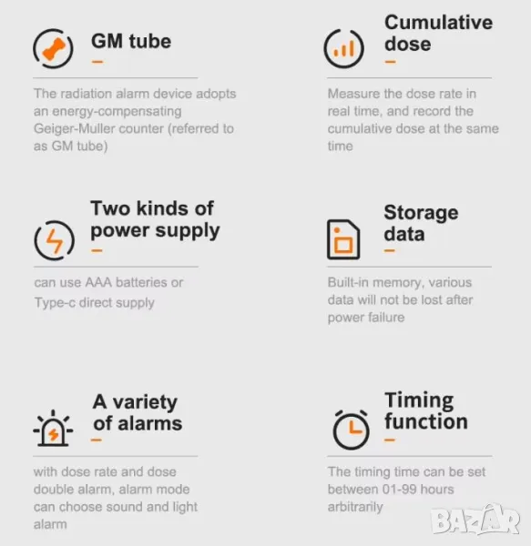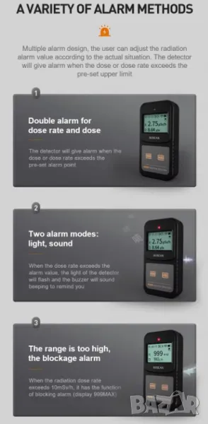 * Вградена двойна алармена функция за дозова скорост и доза.