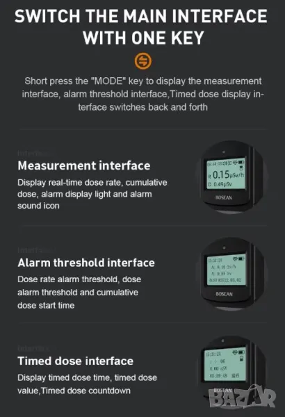 * При превишаване на дозовата скорост от 10mSv/h, устройството има функция за предупреждение (показва 999MAX).