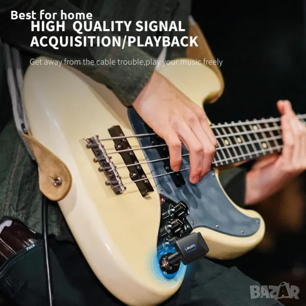 Ясно предаване на сигнала: Тази 5.8G безжична китарна система с 24-битово 48KHz висококачествено аудио излъчване. Висока честота с по-малко от 6ms латентност, без забавяне или загуба на сигнал. ефективният обхват е около 20 метра. Висококачествено възстановяване на оригиналния звук на китара