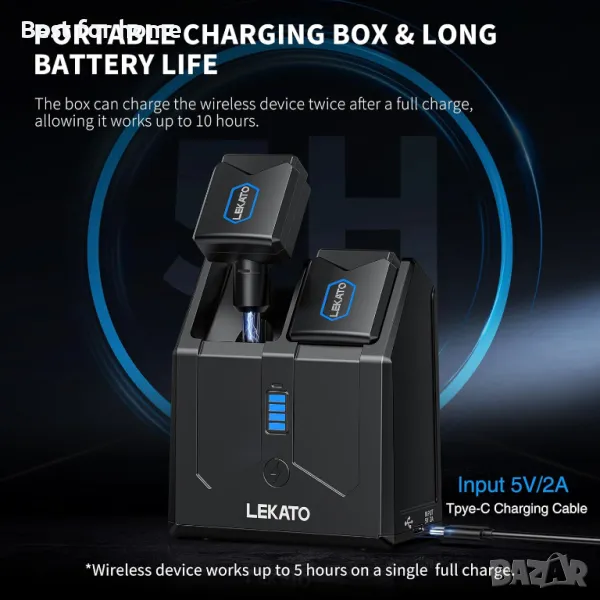 Безжична китарна система с кутия за зареждане: Безжичната китарна система LEKATO JW-06 се предлага с преносима кутия за зареждане, която може да зарежда безжични устройства повече от два пъти, а капацитетът на кутията за зареждане от 5000 mAh осигурява приемник на безжичен предавател за китара допълнителни 12 часа при нужда. OUTPUT конекторът на кутията за зареждане се използва за зареждане на други устройства--телефони/таблети (ЗАБЕЛЕЖКА: Моля, използвайте зарядно устройство 5V/2A, за да заредите кутията за зареждане)