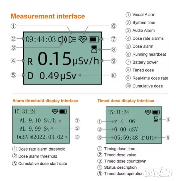 * Прагът на алармата за дозова скорост и за доза може да се регулира и настройва по желание.