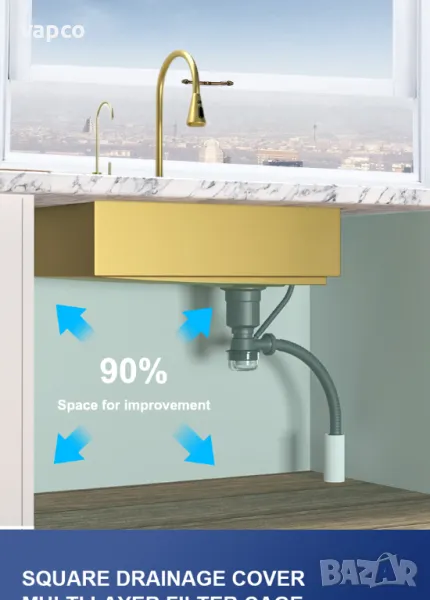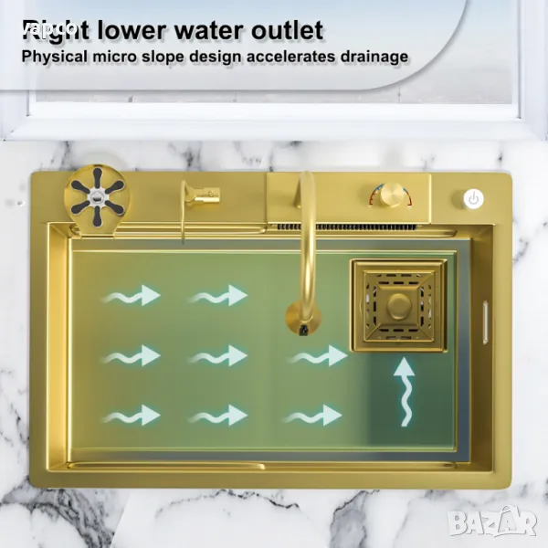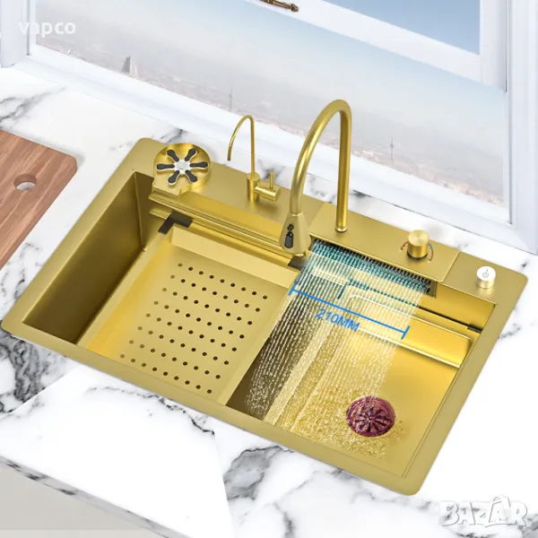Висококачествена мултифункционална мивка от неръждаема стомана. Създава многофункционално работно пространство, за да можете удобно да миете плодове и зеленчуци с нейния уникален водопад и подходяща дренажна кошница. Единичната голяма купа осигурява достатъчно пространство за накисване и почистване на съдове за готвене, докато наклонената основа към единичния изместен дренаж минимизира натрупването на вода. Изработена е от неръждаема стомана с нано покритие, което я прави устойчива на отчупване, напукване или изгаряне, и осигурява години красота и надеждна работа.