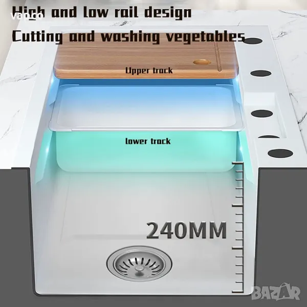Висококачествена мултифункционална мивка. Създава многофункционално работно пространство, за да можете удобно да миете плодове и зеленчуци с нейния уникален водопад и подходяща дренажна кошница. Единичната голяма купа осигурява достатъчно пространство за накисване и почистване на съдове за готвене, докато наклонената основа към единичния изместен дренаж минимизира натрупването на вода. Изработена е от неръждаема стомана с нано покритие, което я прави устойчива на отчупване, напукване или изгаряне, и осигурява години красота и надеждна работа.