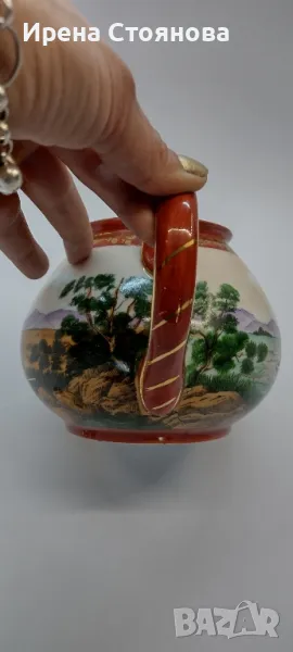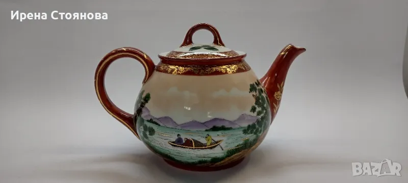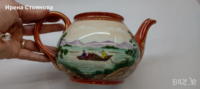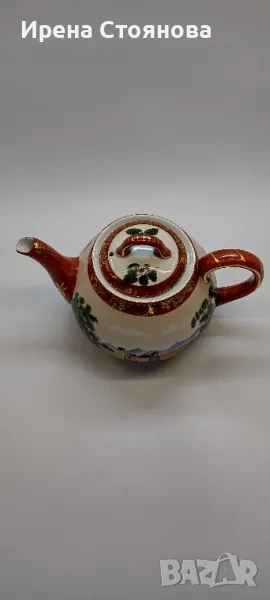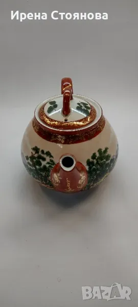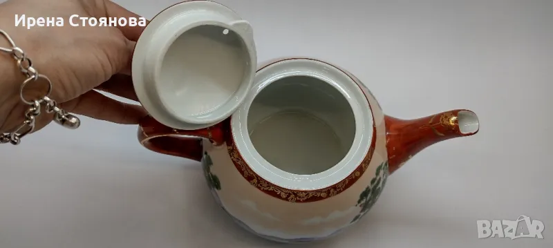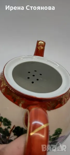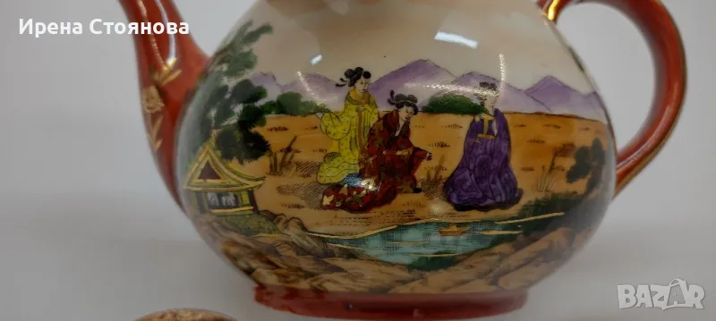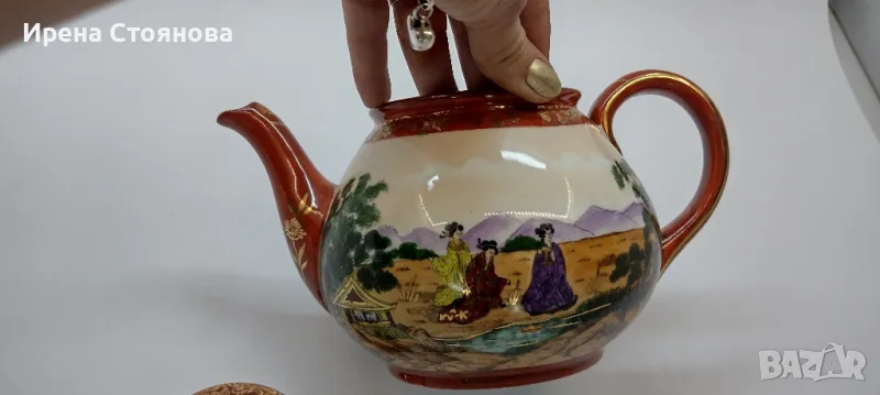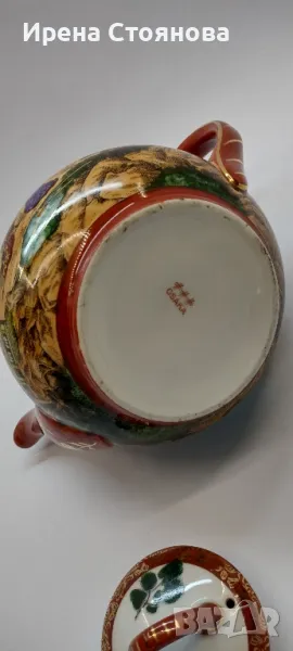 Внушително голям чайник с вместимост 1400 мл, височина с капак 17 см, без 12 см, ширина от дръжка до чучура 23 см. Цена 99 лв.Тук порцеланът не е типичния яйчена черупка, а е костен в млечно бял цвят, фин и нежен. Богато и плътно изрисуван в ярки цветове, златна орнаментика. Гейшите изобразени в декора, символика на престижа. Маркировка ### Osaka, произведен най-вероятно около средата на миналия век. В почти отлично състояние за годините си, без следи от надраскване и употреба. Наличие на захабяване отдолу по ръба на основата, знак за старост.