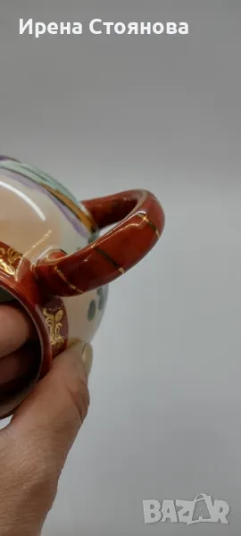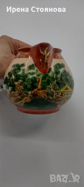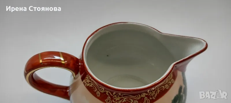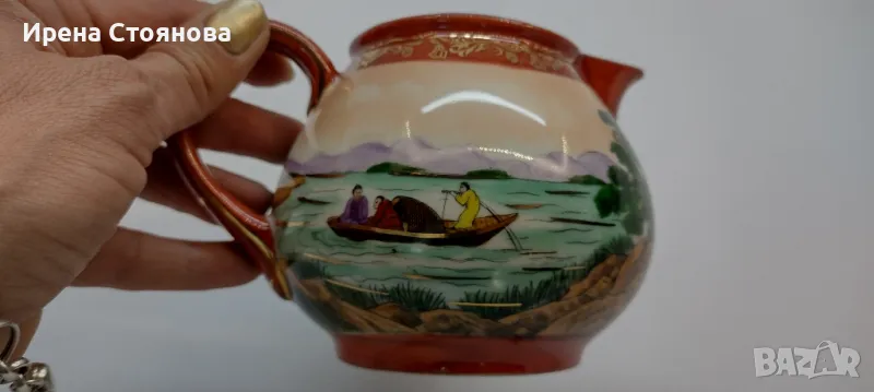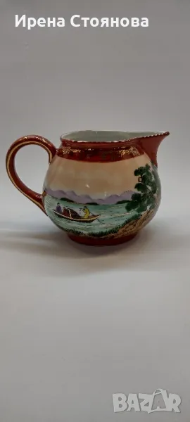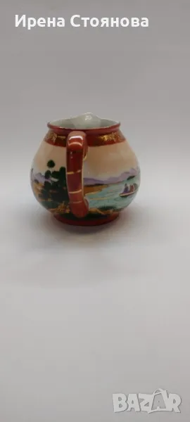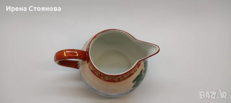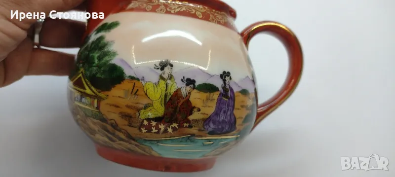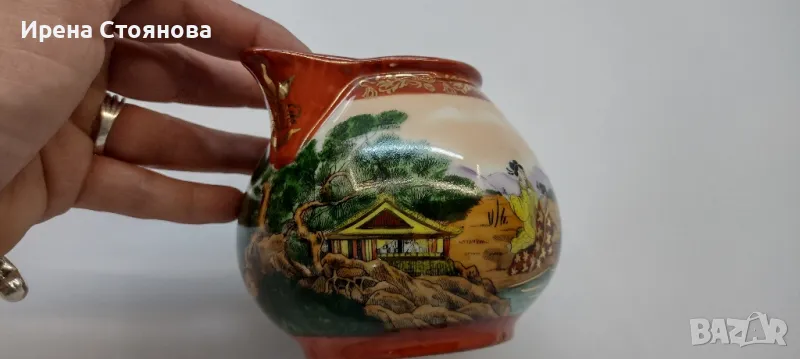 Внушително, голяма аничка за мляко с вместимост 650 мл, височина 10 см, ширина 15,5 см. Цена 49 лв.Тук порцеланът не е типичния яйчена черупка, а е костен в млечно бял цвят, фин и нежен. Богато и плътно изрисуван в ярки цветове, златна орнаментика. Гейшите изобразени в декора, символика на престижа. Маркировка ### Osaka, произведен най-вероятно около средата на миналия век. В почти отлично състояние за годините си, без следи от надраскване и употреба. Наличие на захабяване отдолу по ръба на основата, знак за старост.
