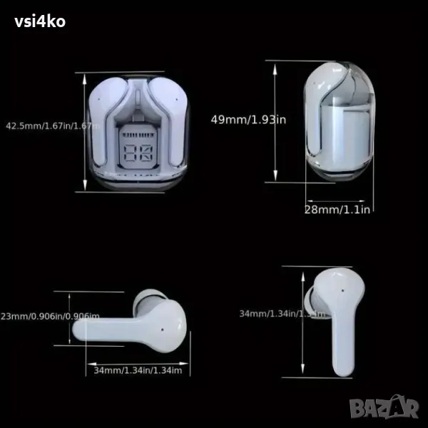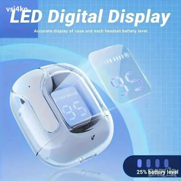 Безжични Bluetooth слушалки с прозрачен кейс и LED дисплей - Модерен дизайн – Слушалките се предлагат в прозрачен кейс с футуристичен и елегантен стил, който позволява да виждате вътрешността на зарядната кутия.