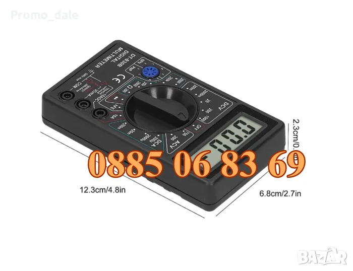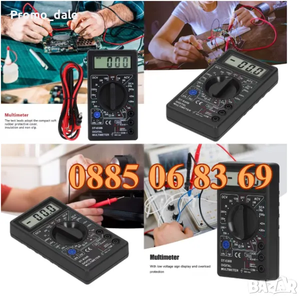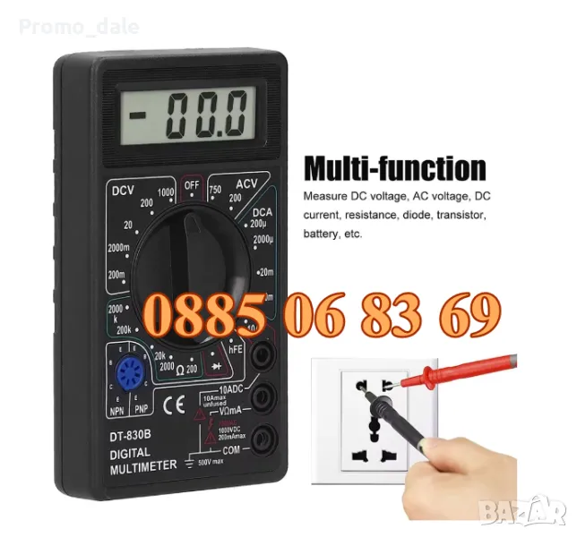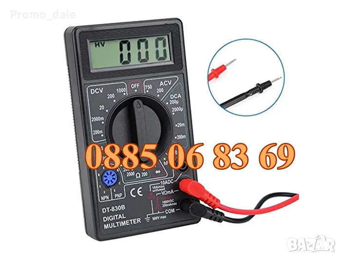 DT-830B е 31/2 цифров мултимер за измерване на постоянно (DC) и променливо (AC) напрежение, DC ток, съпротивление, диоден и транзисторен тест. Разполага със защита от претоварване и индикатор за слаба батерия. Идеален инструмент за лаборатории, работилници, хоби и домашно приложение.