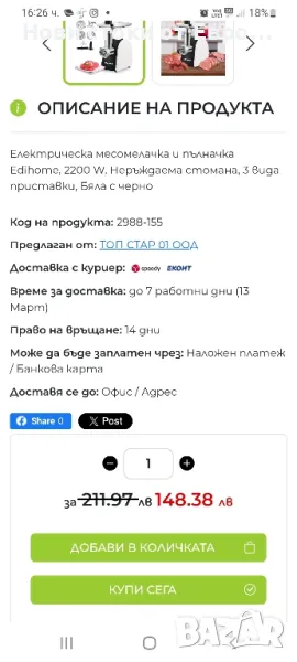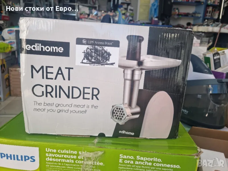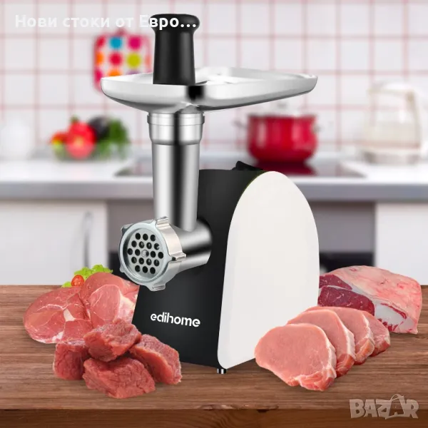 пълначка Edihome, 2200 W, Неръждаема стомана, 3 вида приставки, Бяла с черноМесомелачката и пълначка Edihome е бърза и функционална и прави нарязването на месо много по-удобно и по-бързо от нарязването на ръка, с трапецовиден дизайн и подсилен корпус за голяма стабилност.3 различни вида остриета от неръждаема стомана (фино, средно и грубо), практичен плъзгач за месо, приставка за кубчета и пълнител за колбаси.Можете да контролирате съдържанието на мазнини в месото във вашите ястия, нейният шнек за смилане от неръждаема стомана поддържа месото свежо и запазва структурата и вкуса му, спестявайки ви място и време, когато приготвяте ястията си.Нашата месомелачка edihome работи като месомелачка, пълнител за колбаси, идеален за приготвяне на кубе, хамбургери, болонезе, пълнеж за пайове, домашно приготвени кюфтета и др.Внимание: Не използвайте месомелачката edihome за смачкване на сухожилия, кожа, замразено или размразено месо, кости, мазнини и други вещества с подобен вискозитет. Тези храни могат да повредят двигателя, остриетата и други елементи на месомелачката и да представляват злоупотреба, която ще анулира гаранцията на продукта.Не може да се мие в съдомиялна машина, алуминиевите части се почистват с топла вода и на ръка, не се почистват с алкали или белина. Не прегрявайте двигателя, този уред е подходящ за домашна употреба, а не за нарязване на големи количества месо.