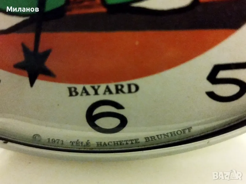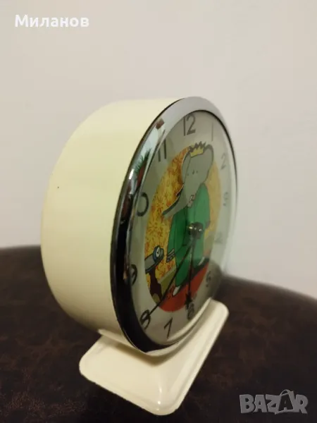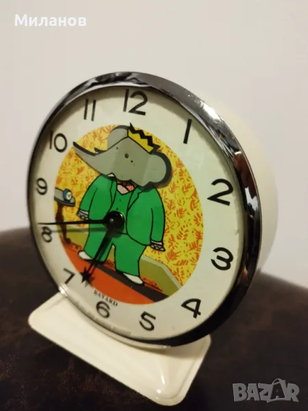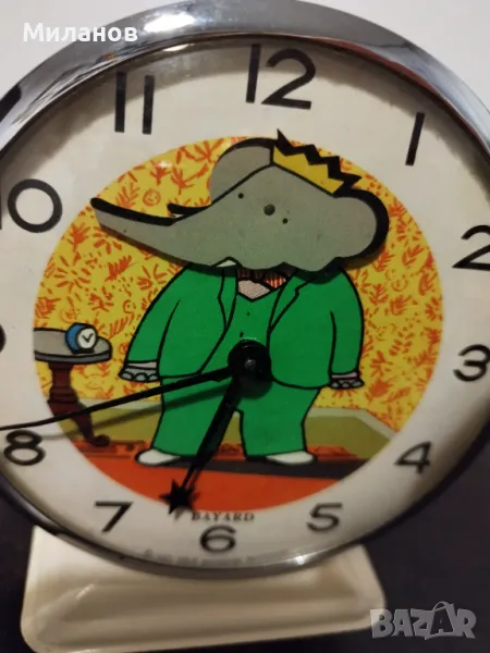 Стар механичен френски анимиран будилник Баярд.От 2971-а година, рядък.Работи и звъни.Слончето се казва Бар, мисля че е герой в стари комикси.Диаметур-111 милиметра.Номер на часовника-3580273