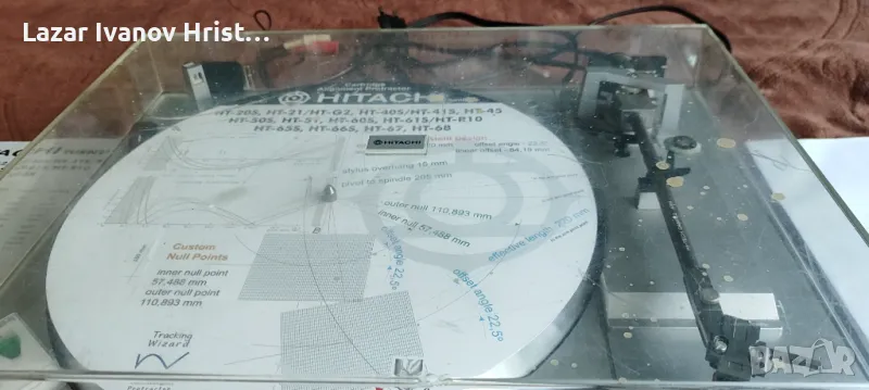 Много добре свирещ грамофон от този клас.Доза АТ95 със игла в много добро съзтояние + чисто нова ,неотваряна елиптична игла.Чисто нова ,неизползвана плоча за фина настройка на антискейтинг(празна) и не на последно място чисто нов протрактор точно за този модел грамофони и останалите от серията HT на Хитачи.По-добра оферта-"здраве му кажи"...Машината е пълен автомат,но е направена на полуавтомат като е спряна светлината от лампичката определяща големината на плочата.Определено така е много по-добре.Капак за полиране,така е закупен и съвсем не пречи на звука му:D