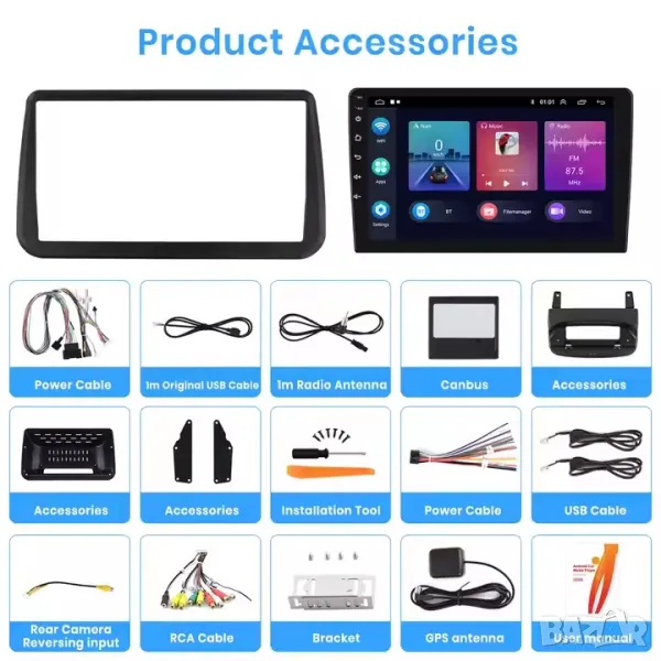 Пълен комплект с цялата рамка, преходни кабели и букси, декодери, предназначени и съвместими за монтиране на конкретния модел автомобил.