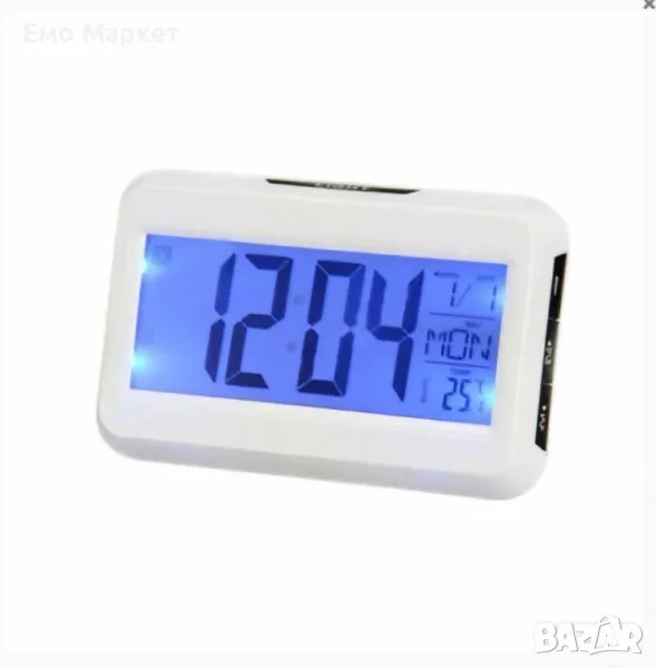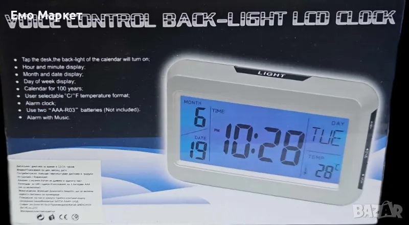 Термометър, аларма, календар, таймер и гласов контрол за активиране на светлината, часовник активиране светлината на дисплея чрез глас, по-силен звук, почукване на плота или на самият часовник.