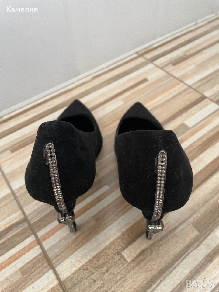 Използвани са малко. Отзад на токчето имат по една метална лента с камъчета. Тук там липсват камъчета и от горната страна лентата е разлепена.