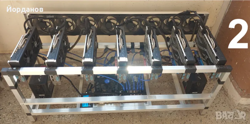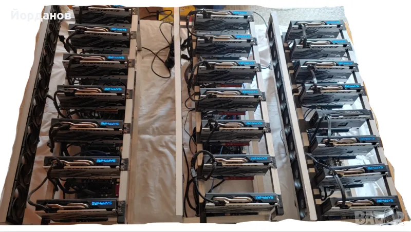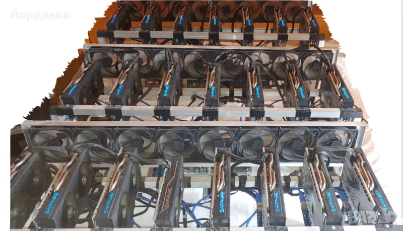 Риговете са правени от мен с голямо старание и внимание към детайла. Общо са с 22бр. видео карти 8GB. Използвал съм най-високо качество на рамката и охлаждането както и на самите компоненти. Последните 3 години и 7 месеца не са работили. А преди това два от риговете работиха около 2г., а единия около година. Никога не са прегрявани и са били почиствани с редовно с компресор. Сега ги пуснах само за снимките. За повече информация, можете да ми се обадите по телефона. Възможен е бартер за автомобил или мотоциклет.