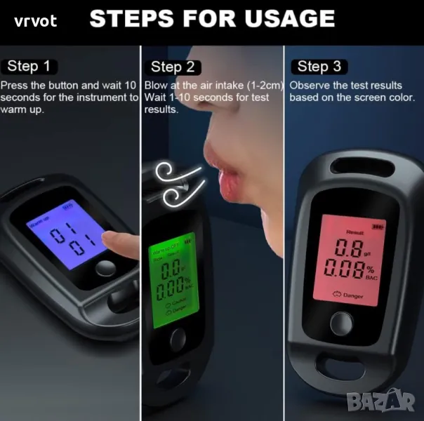 [ Безконтактен тест ] Лесен за използване чрез натискане на превключвателя и изчакване за 10 секунди, за да се загрее, след което издухване за 3-10 секунди, Алкотестерът за алкохол ви позволява лесно да преглеждате резултатите на дисплея, включващ безконтактно издухване с уста.