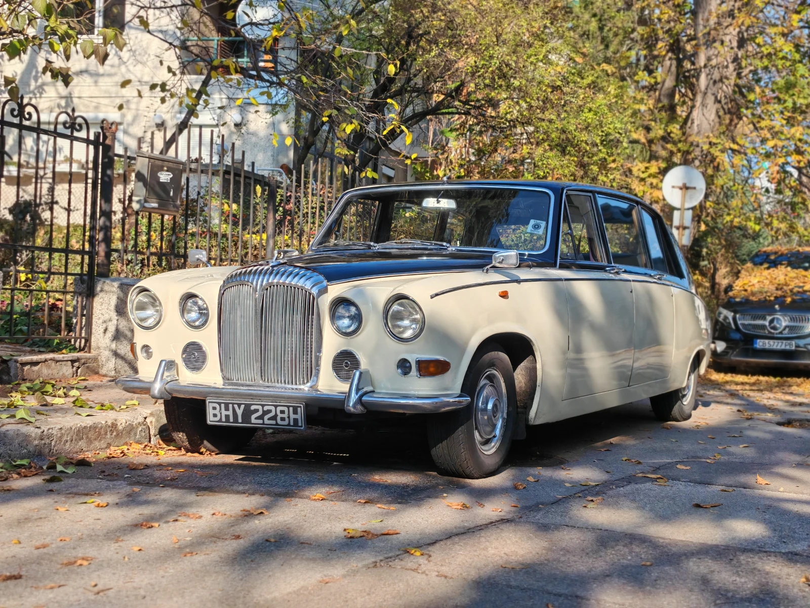 1970 Daimler DS420 Vanden Plas Една класическа лимозина, от времето, в което аристокрацията е била в апогея си. Този изискан екземпляр е създаден през далечната 1970та година и е един от първите бройки, излезли от ателието за ръчна изработка на лимузини Vanden Plas London. Обръщам внимание, че през 1980та ателието Vanden Plas, за съжаление фалира и производството се премества във фабриката на Jaguar. Този автомобил е от истинските ръчно произведени и далеч по-ценени екземпляри. С дължина от 5. 74см, присъствието му откворено е внушително, но английският инженерен професионализъм е довел до един учудващо маневрен и приятен за шофиране луксозен автомобил. Двигателят е 4. 2л Шест цилиндров Редови, произвеждащ 163к. с. и 309 Нютон метра, свързан с класическата за Jaguar / Daimler GM400 - три степенна автоматична скоростна кутия, със скоростен лост на кормилната колона. Със своите 7+1 места, може да предложи изискан комфорт на цяло сватбено семейство или огромно свободно пространство за Аристокрацията, която превозва. (както и усамотение и спокойствие, ако се затвори стъклената преграда между шофьора и пасажерите) Автомобилът е в максимално оригинален вид, като през последните 2 години са извършени няколко технически ремонта, за да се гарантира здравина и надеждност при употреба: - извършена е пълна ревизия и настройка на карбураторите и горивната помпа -подменени са всички тампони по носачи и стабилизиращи щанги и цялостна ревизия на окачването -Пълно сервизиване на спирачна система подмяна на дискове и накладки -конверсия към електронно запалване и това бобина и сменени 6 свещи -нов резервоар -сменени масла и филтри на двигател и скоростна кутия