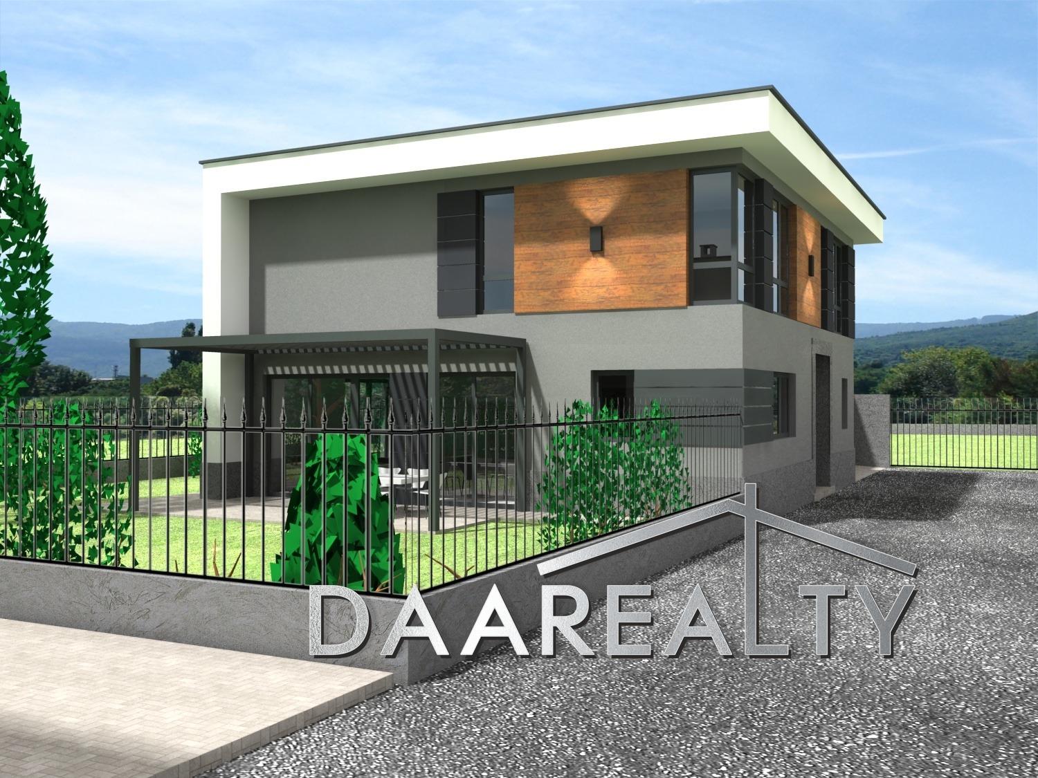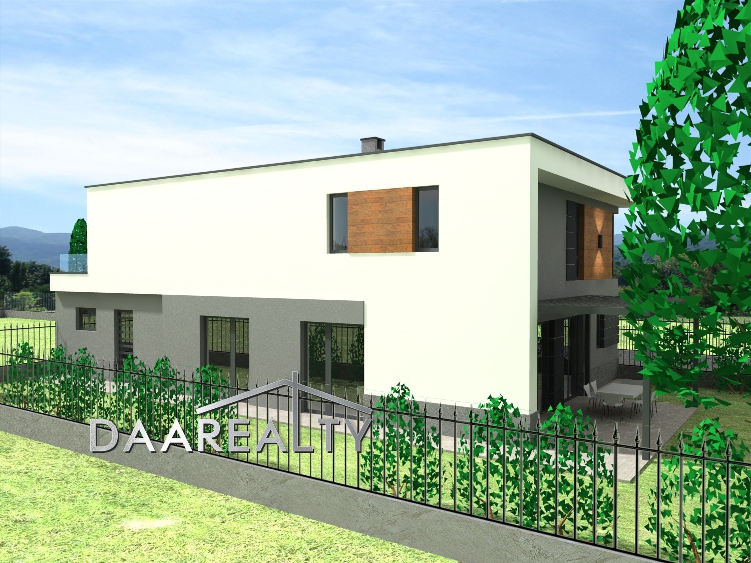 Екстериорът на къщата впечатлява с модерна архитектурна визия, изпълнена с комбинация от Еталбонд и HPL фасадни панели, осигуряващи дълготрайност, устойчивост на атмосферни влияния и елегантен, съвременен облик. Висококачествената алуминиева дограма гарантира отлична топло- и шумоизолация и максимална естествена осветеност. Към дневната зона е проектирана просторна веранда, създаваща естествена връзка между интериора и собствения двор.