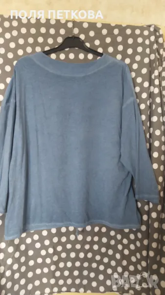 Ефектна блуза в синьо ситен рипс памучна еластична материя с ефектен принт от тигрово и камъни отдолу е с връзки може да се носи и в широк вариант и в по-къс става за размер XL и XXL гръдна 130 135 дължина 70 см лека и удобна за носене