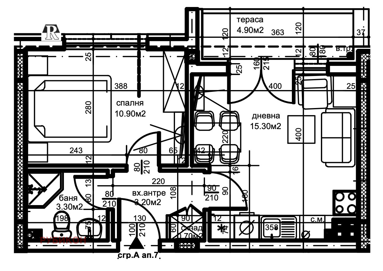 Разпределението на апартамента е както следва: просторна дневна с кухненски бокс( 15.30кв.м),спалня(10.90кв.м), баня с тоалетна(3.30кв.м), антре(3.20кв.м),тераса(4.90кв.м) и склад(0.7кв.м.). Застроена площ 44.70 кв.м. Общи части - 6,14 кв.м. Обща площ- 50.84кв.м.
