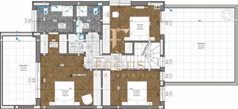 - втори етаж: коридор, три спални, две бани с тоалетни, дрешник, мокро помещение и две тераси.