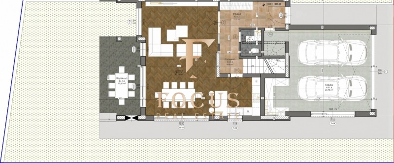 - първи етаж: двоен гараж с топла връзка, коридор, хол с кухненски бокс, тоалетна и веранда - 17,60 кв.м.;