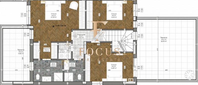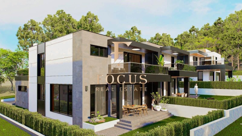 - втори етаж: коридор, три спални, две бани с тоалетни, дрешник, мокро помещение и две тераси.