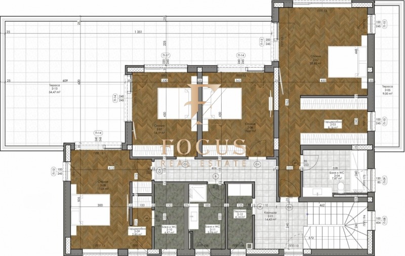 - втори етаж: коридор, четири спални, три бани с тоалетни, две дрешника, мокро помещение и две тераси.