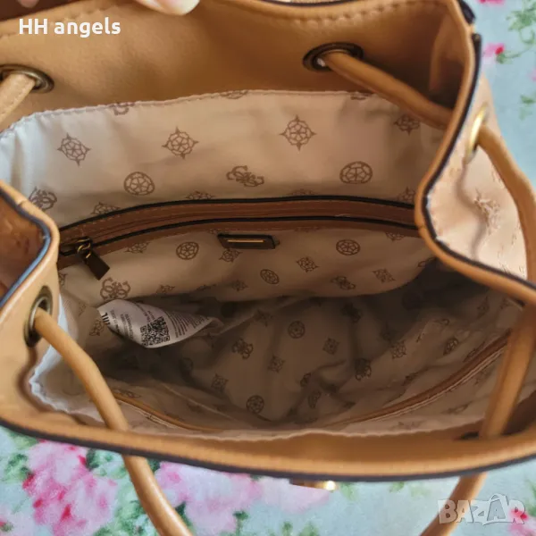 Чисто нова раница на Guess модел:Helaina в кафяв цвят.Изработена от висококачествена еко кожа с 4G релефни лого мотиви по цялата раница.Разполага с преден джоб с цип,регулеруеми презрамки.Затварянето е с пристягащ шнур и закопчаване с капак с магнитно копче.Като размери е 30 височина, 25 см ширина и дъно 12 см.Точно този цвят към този момент по бг сайтовете се продава между 250 -350лв.Цената ми е повече от символична.Раницата е с противопрахова торбичка.