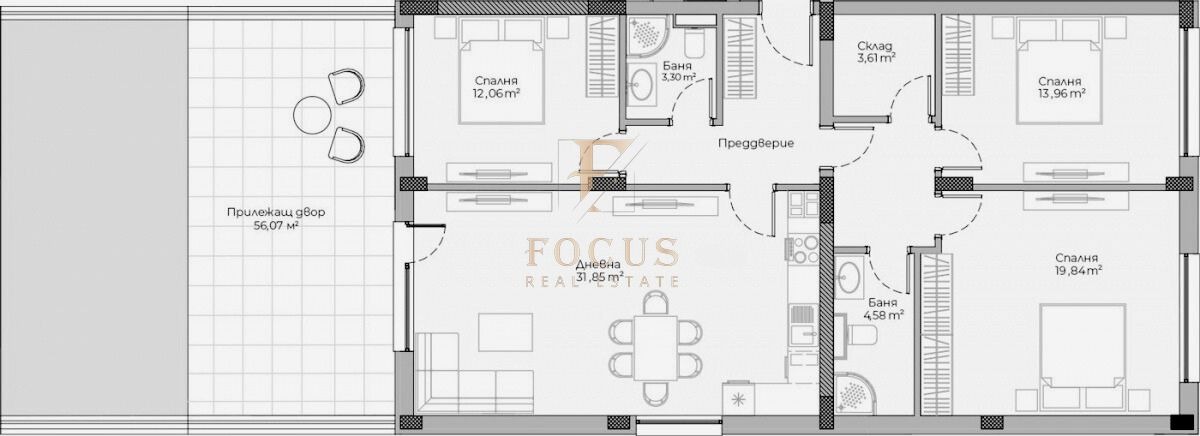 Разпределение: антре, просторна дневна с кухненски бокс, три спални, две бани с тоалетни, склад и прилежащ двор.