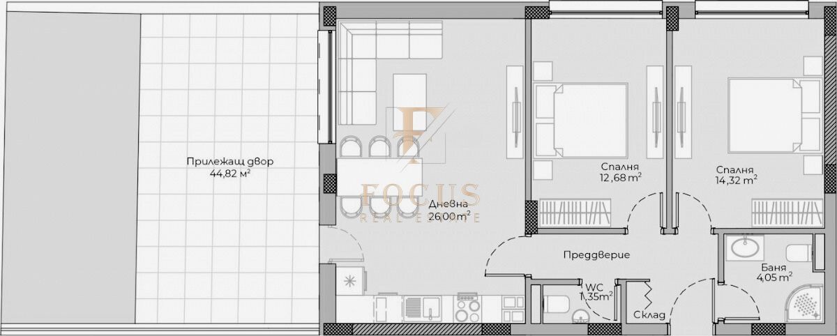 Апартаментът предлага практично разпределение и собствен двор, който създава усещане за повече пространство и комфорт в ежедневието.