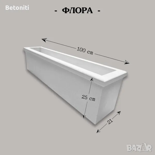Цвета на изделието може да бъде бял натурален бетон или допълнително оцветен/състарен в нюанс по желание на клиента.