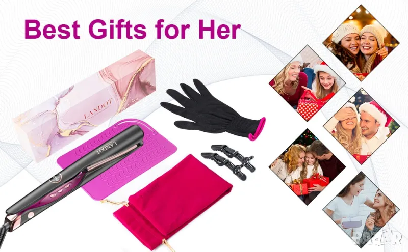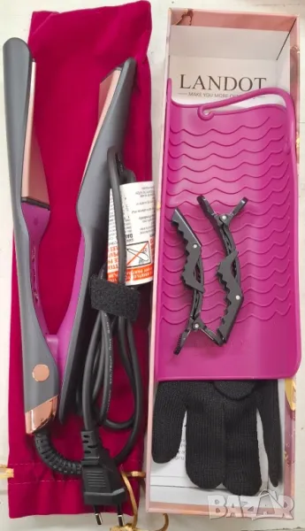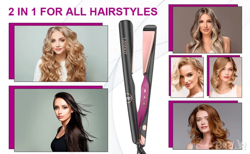 преса за коса 2 в 1 за къдрене и изправяне с нов революционен дизайн с извити керамични плочи, LED дисплей, регулируема температура от 120*С до 230*С, бързо нагряване за 30 секунди, автоматично безопасно изключване след 60 минути, въртящ се на 360* кабел с дължина 2 м., топлоустойчива силиконова подложка и калъф за лесно съхранение.