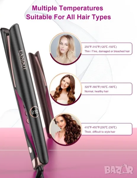 Подходяща за всички типове коса: извитата преса за къдрене е с 12 променливи температурни настройки 120-230*С и LCD цифров дисплей, която пасва добре на всички типове коса (дълга, къса, гъста, естествена и фина/тънка коса).