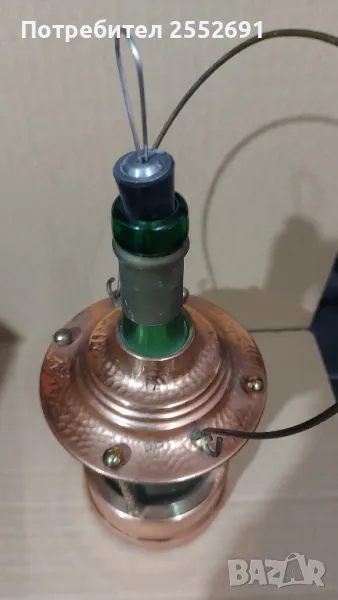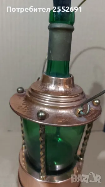 Винтидж красиво и стилно изделие от мед и месинг, вграждащо стъклена бутилка. В основата- работеща музикална кутия. Височина- 29см Диаметър на основата- 9,5см.