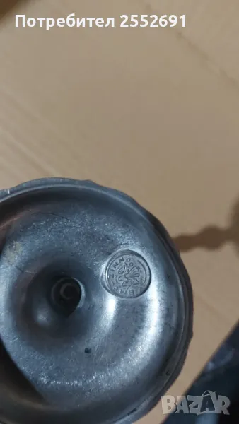 Стилен, масивен, старинен свещник. Диаметър на горната част- 5см. Диаметър на основата- 7см. Височина-14 см. Наличие на фирмен знак " ВМF - ZINN"