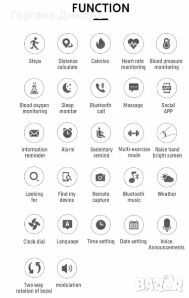 Спортна гривна, монитор на сърдечния ритъм, напомняне за съобщения, измерване на скоростта, дистанционно управление, календар, проследяване на съня, напомняне за повикване, показване на кислород в кръвта, автоматично повикване.