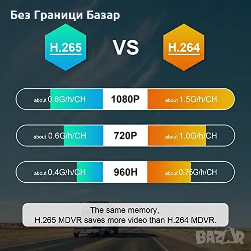 Дълъг цикличен запис – Поддържа 2x 512GB SD карти (не са включени), H.265 кодиране за 30-40% повече пространство.