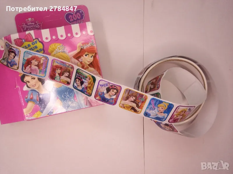 Ролка с 200 броя стикера: Снежанка, Пепеляшка, Ариел, Рапунцел, Белла, Спящата красавица.