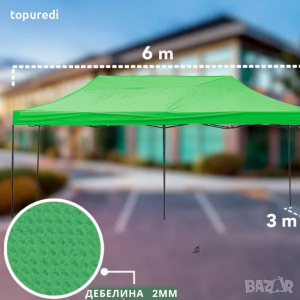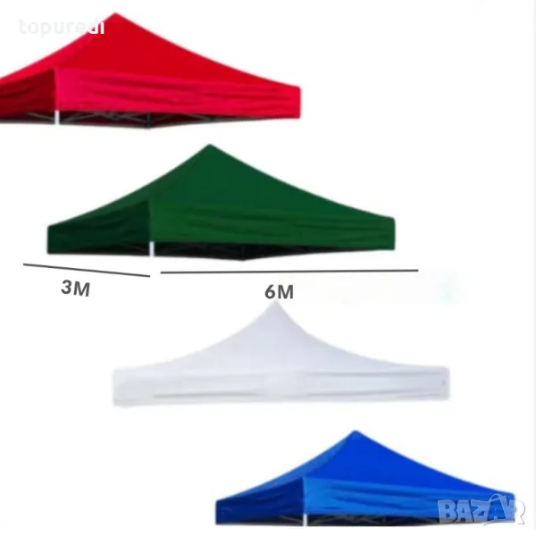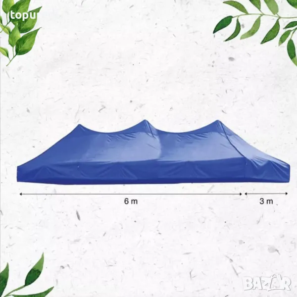 Висококачествено покривало, предназначено за шатри с размери 3x6 метра. Осигурява надеждна защита от слънце, дъжд и вятър, като същевременно придава завършен и елегантен вид на вашата шатра. Полиетилен с полиакрилатно покритие, гумирано от вътрешна страна .