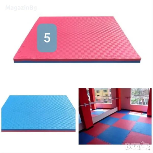 #5 Двупластова настилка татами, изработена от висококачествен материал EVA. Подходяща за спортни зали и за домашна употреба. Може да бъде използвана и като подложка за фитнес уреди. Цветове - двуцветна /син и червен/. Съединяване тип пъзел. Цената е за 1 брой. Размери - 100х100х2.5 см. Тегло за 1 брой - 2 кг.