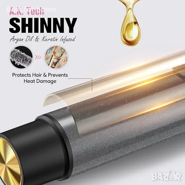 Арганово масло, кератин и цилиндър с турмалин с подхранващи свойства и освобождаване на милиони отрицателни йони при нагряване, което може да намали къдренето и да осигури по-гладка текстура на косата. Резултатът е блестящи и великолепни къдрици или естествени и меки масивни вълни.